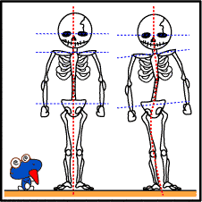 左が正常な姿勢、右がゆがんだ姿勢。 どうですか?体の中心がグニャっと曲がっているのがわかりますか? これは大げさに描いているわけではなく、現代人の体には同じ事が起こっています。これよりひどい体の人も存在してますし・・・。 あなたは肩の高さが左右でくるっていませんか? |